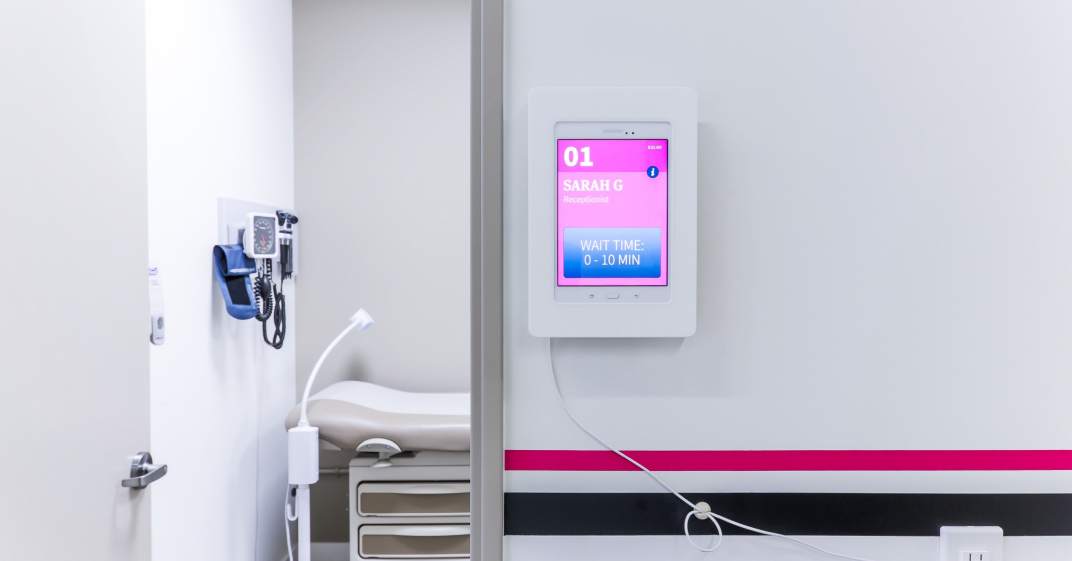 When a clinician enters the room, they tap “check in” on the tablet. After the appointment, one more tap “checks out” the patient and flags the room’s status for the rest of the team. Screens throughout the clinic show room availability in real time: occupied, free, or in need of cleaning.